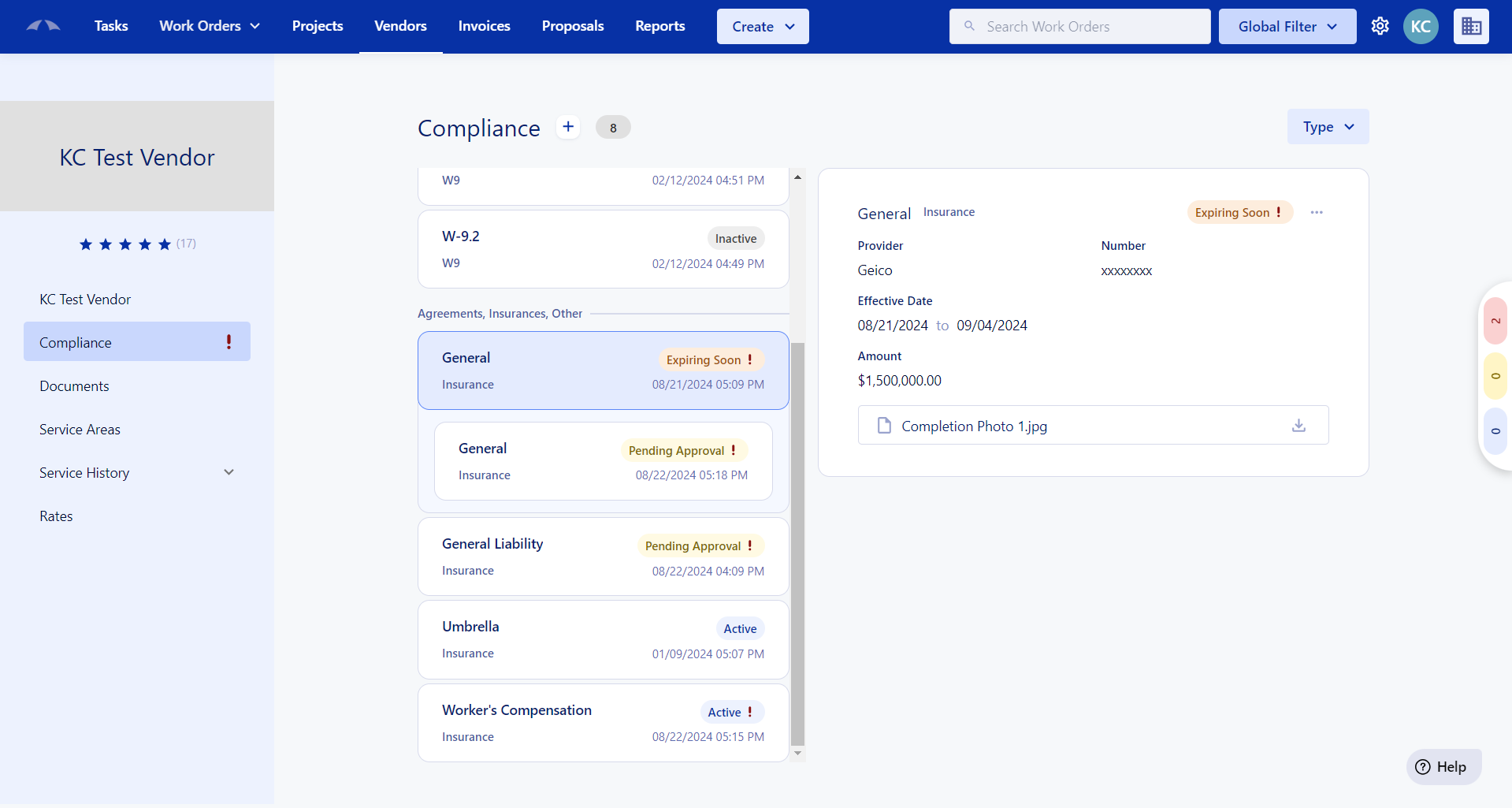 A vendors compliance items are their documentation that prove that they are qualified or insured to do the job at hand. This is where Vendors will show their insurance policies, contracts, W-9 and more.