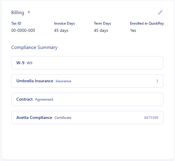 The vendor profile shows an overview of their compliance on the Details page in the Billing section.