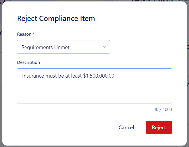 From here, you can review the compliance items that vendors have submitted to you, and Accept or Reject the compliance.