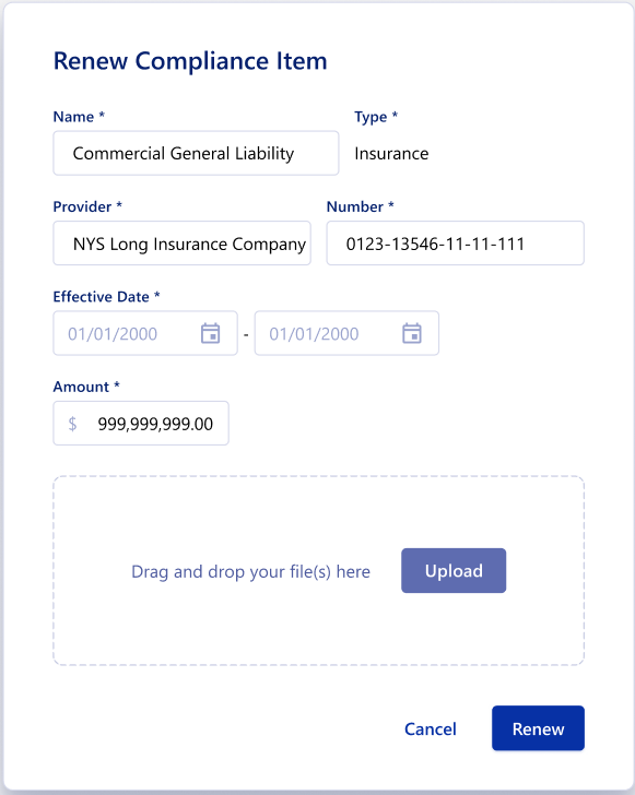 Renew allows you to update an older compliance item. You can update the information and document in the compliance item. The renewed item will use the newly input date as a new expiration window, and take over the compliance item that was renewed.
