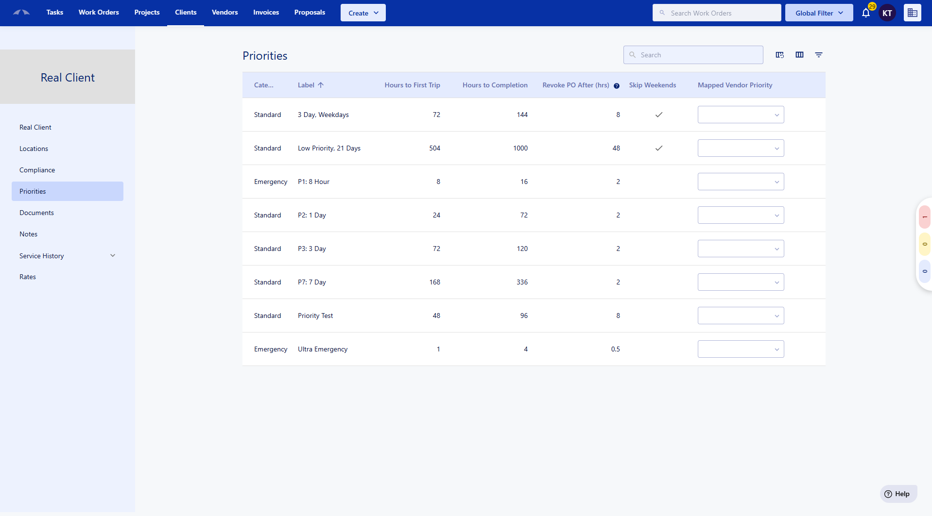 Mapping a priority makes it so that when a work order is created by the client with the mapped priority, it will show you the correlating priority that you set for the mapping. If your client uses terms like 'Sev 2' and your company refers to that SLA as 'Same Day 24 hour', then a 'Sev 2' work order is dispatched to you will say 'Same Day 24 hour' on your end.