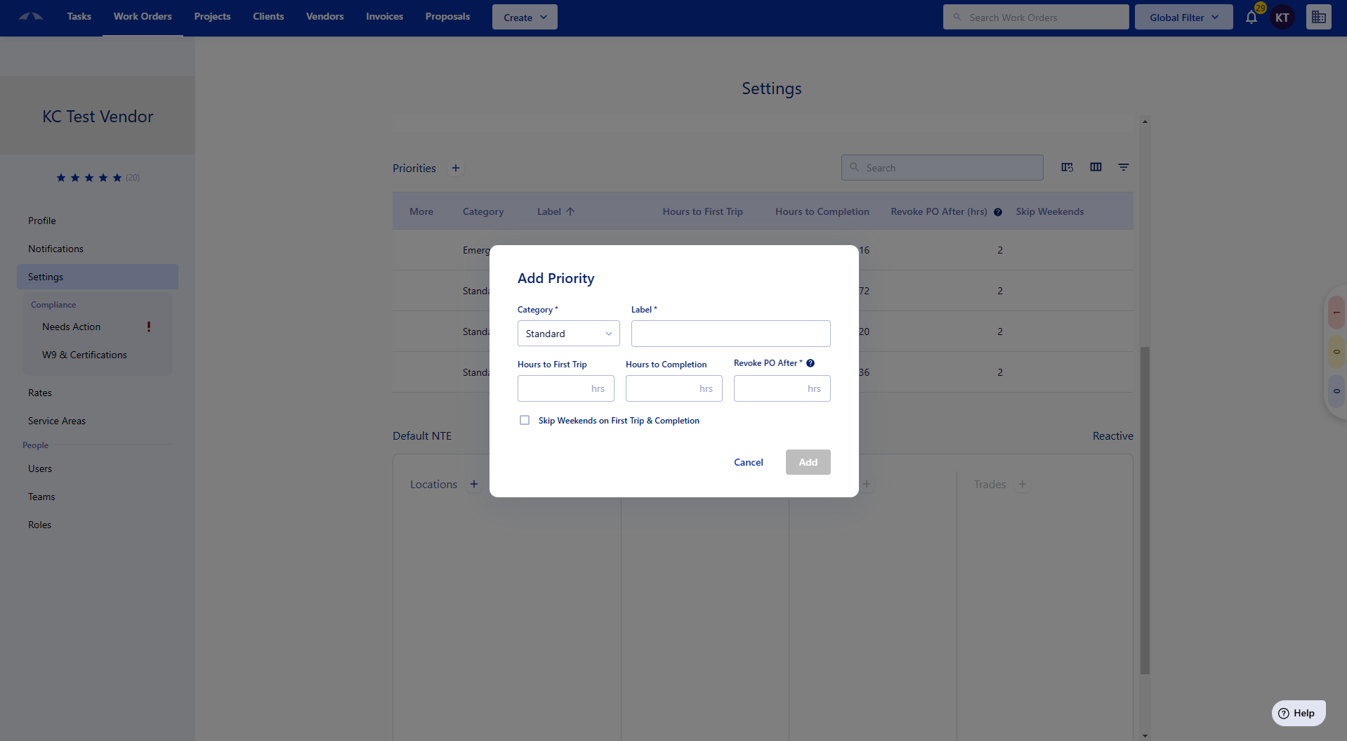 The label acts as a name for your priority and is what is seen on your work order when the priority is selected. The Hours to First Trip and Completion will set your SLA based on when the work order is assigned to you. The Revoke PO After field will change the phase of a purchase order that is assigned to a vendor, if they do not accept the purchase order within the set amount of hours.