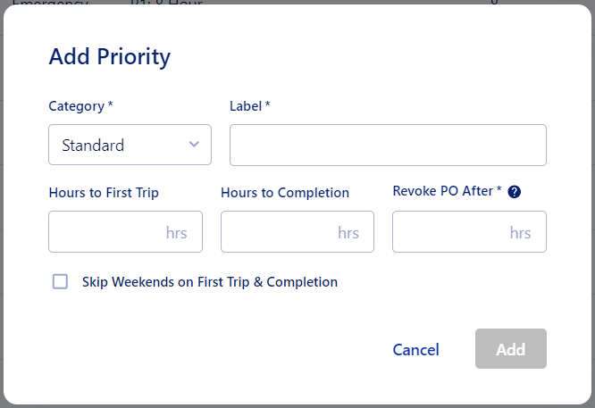 Priorities are set up with Categories, Labels, and hours for the work order. You add a priority by clicking the '+' button at the top of the Priorities List, and opening the Add Priority screen.