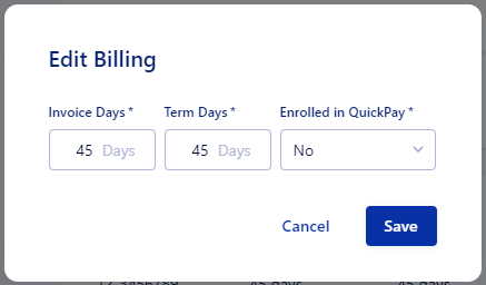 To edit the Billing information, click the pencil icon in the top right corner of the Billing section to open the Edit Billing screen. This allows you to make changes to the information in the billing card.