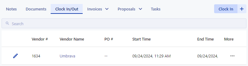 The Clock In/Out tab of a work order keeps track of vendors clocking in and out of your work order. The Vendor will be able to clock in and out on this page.
