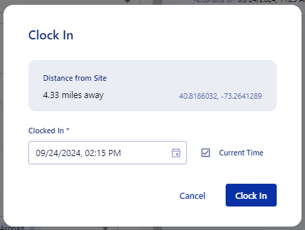 Hitting the 'Clock In' button opens up a panel that shows the current location of the user and the current time. The Clock In time can be changed to retroactively check into a work order by clicking the 'Now' toggle and inputting a different time. Clocking in will change the Work Order Status to 'On-Site'.