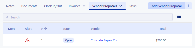 The Proposals tab operates very similarly to the Invoices tab. The Proposals tab has two sub-tabs that lead to Client Proposals and Vendor Proposals. Proposals for this work order can be viewed and created here. The proposal process is broken down in more detail here.