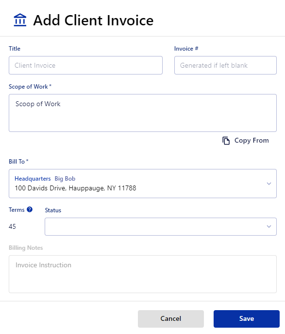 - if left blank, the invoice title will auto-generate based on the number of invoices in the work order.