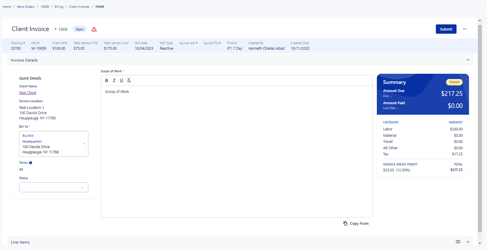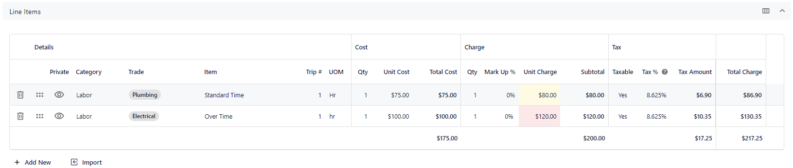 Line items are what controls the costs/value of an invoice. Line items are used to break down the pricing in a work order. Lets break down what a line item is composed of.