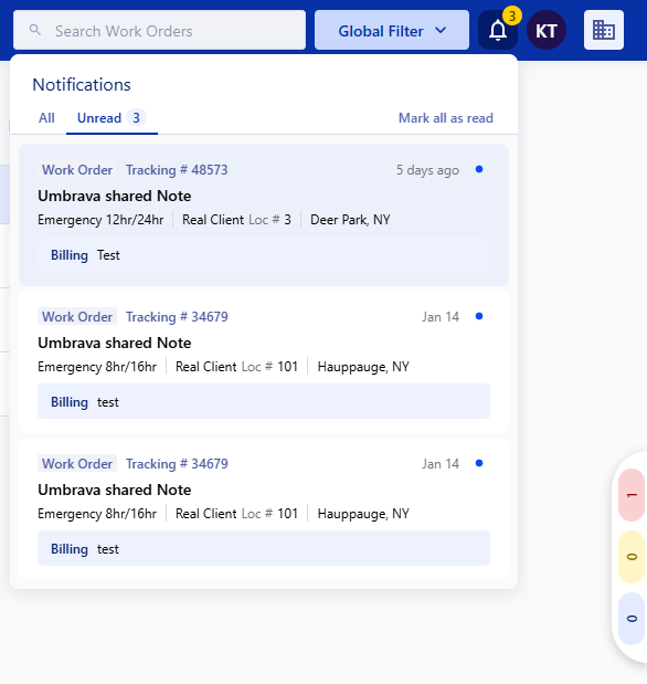 You are able to view all unread notifications in one list to easily see any notification you may not have seen the email for. You can mark a notification as read by clicking on the notification, clicking "Mark all as read", or by clicking the blue unread indicator in the top right of each notification.