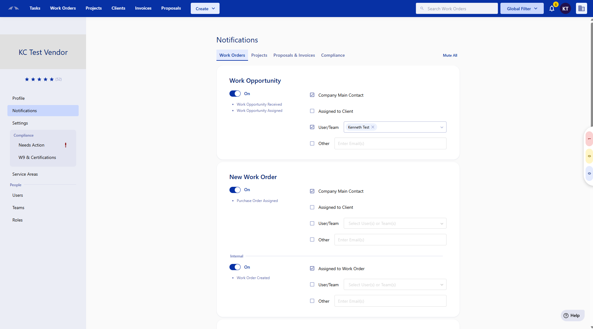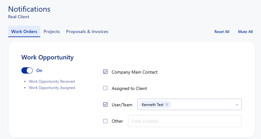 Selecting 'Mute All' on the client page, will turn off all notifications that are supposed to be sent for any work order or project for that client.