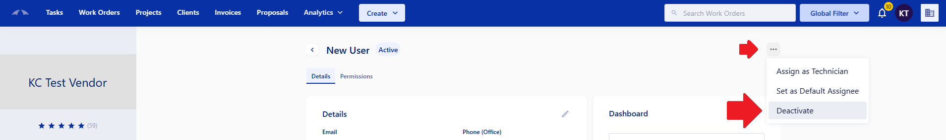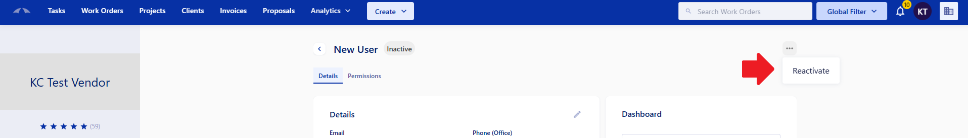 Reactivating will allow the user to be turned into a contact and be assigned to work orders/clients again.