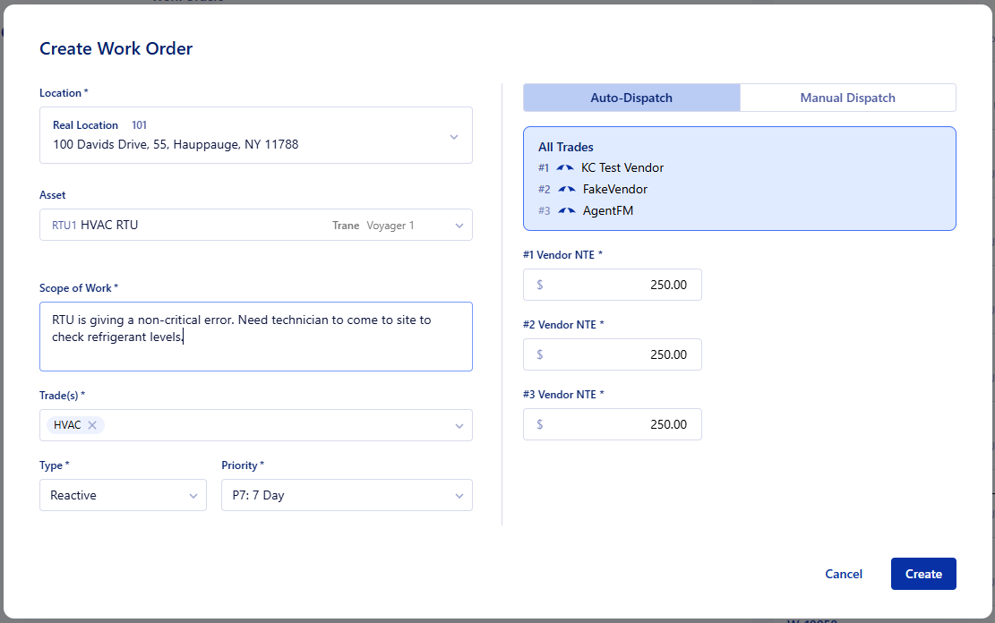 This view shows our Auto-Dispatch feature with 3 vendors set and their corresponding NTEs. Select Manual Dispatch to select a different vendor, or create the Work Order without a vendor Purchase Order attached.