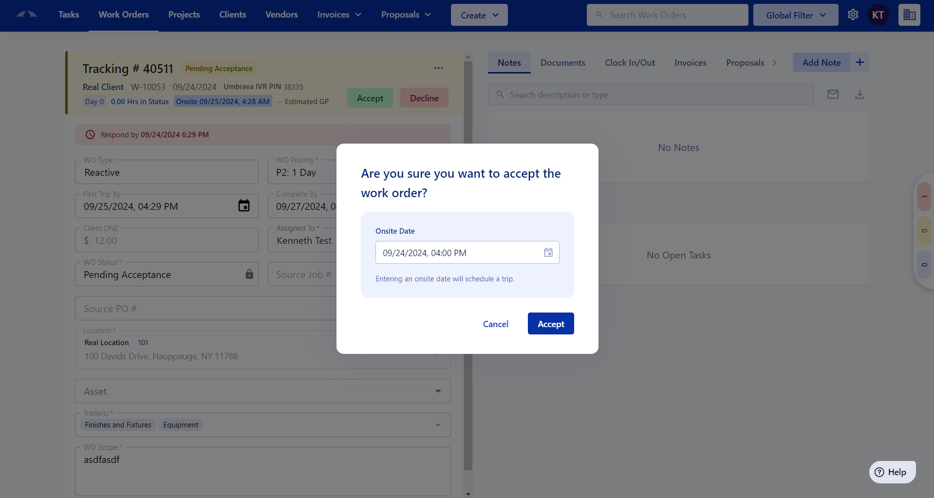 Step 3: The Work Order will open in Umbrava to confirm your choice. |