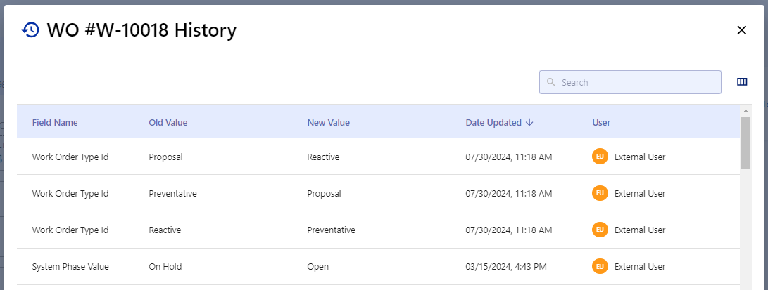 Display the WO Type instead of ID in WO Audit Trail (US-4333): We've adjusted the display of the audit trail for Work Orders to now show the Work Order Type instead of just showing the ID Number for the Work Order Type. You won't need to reference a report in order to access this information anymore.