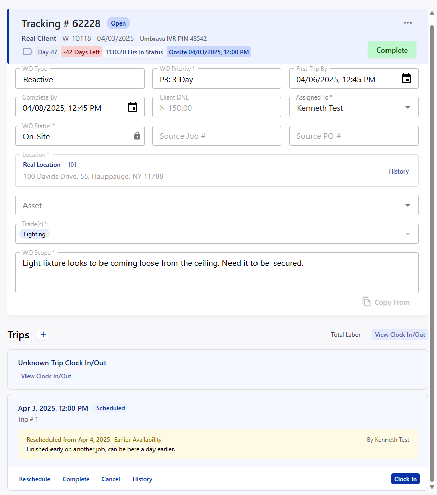 Clocking in updates the Work Order status to 'On-Site'.