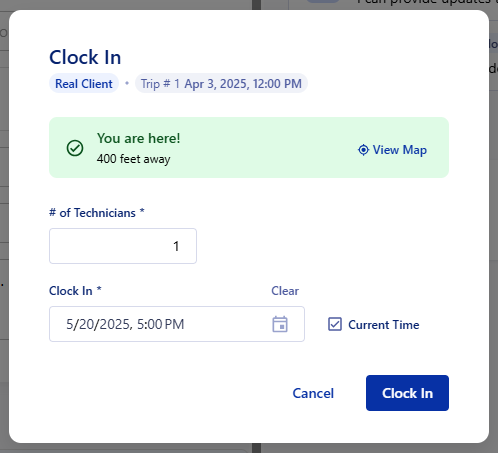 Step 4: Confirm that you are onsite and click 'Clock In'. |