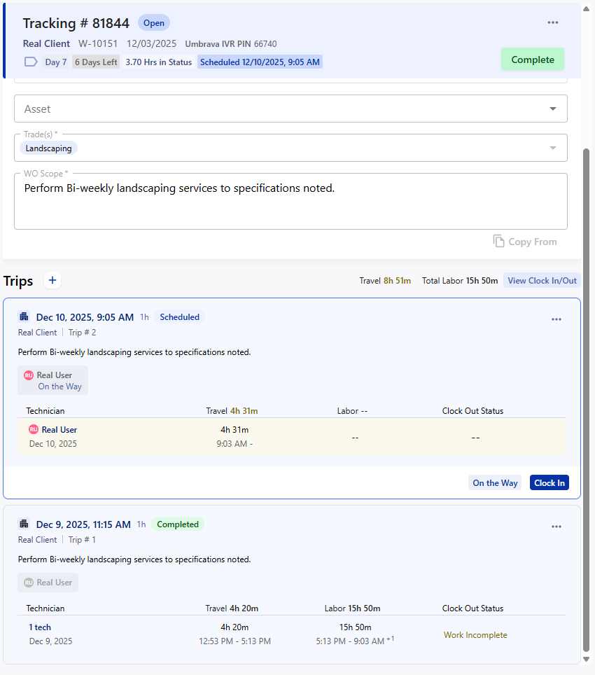 Step 5: Once work is completed, return to the trip and select the 'Clock Out' option. |