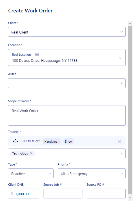 Client DNE on Create Work Order (US-7669): The first thing that most users add once a work order is created is a Client DNE. We decided to add this field to Work Order creation to save you time from having to go in once the work order is created.