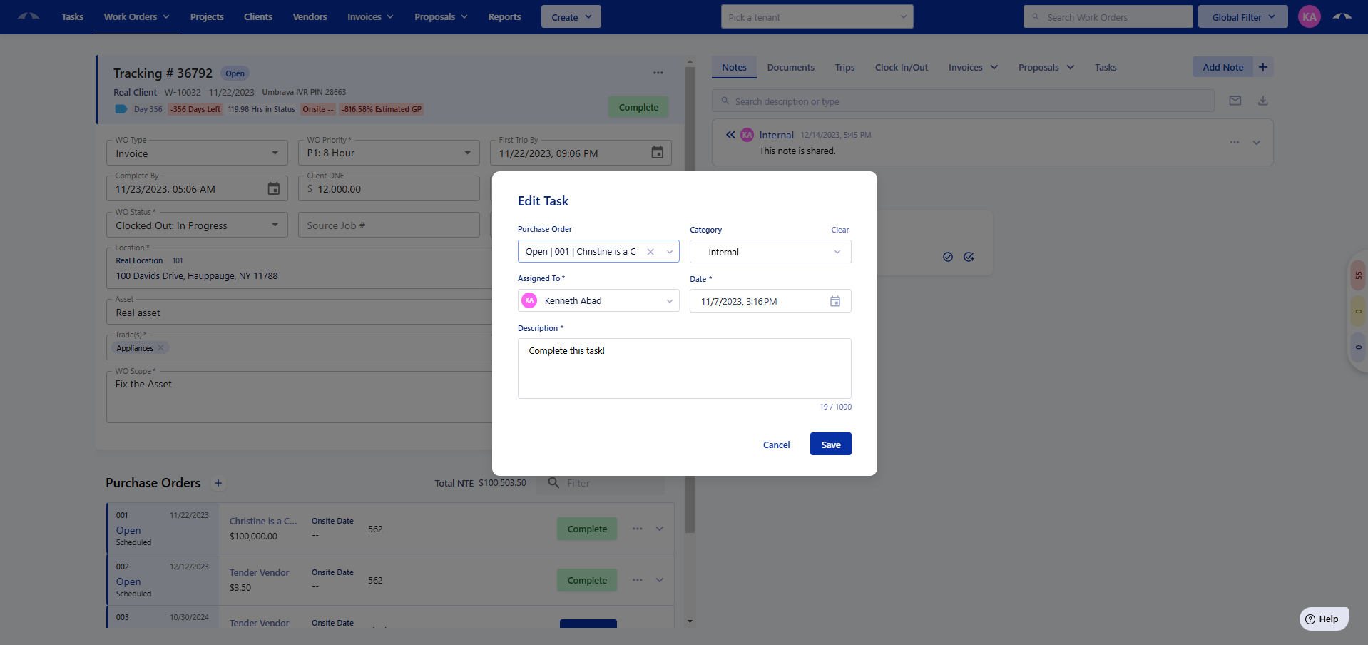 Edit Task from Work Order Details (US-7855): You will now have the ability to edit the tasks from the Work Order details page. Click on the task to open up the edit screen and make changes as needed.