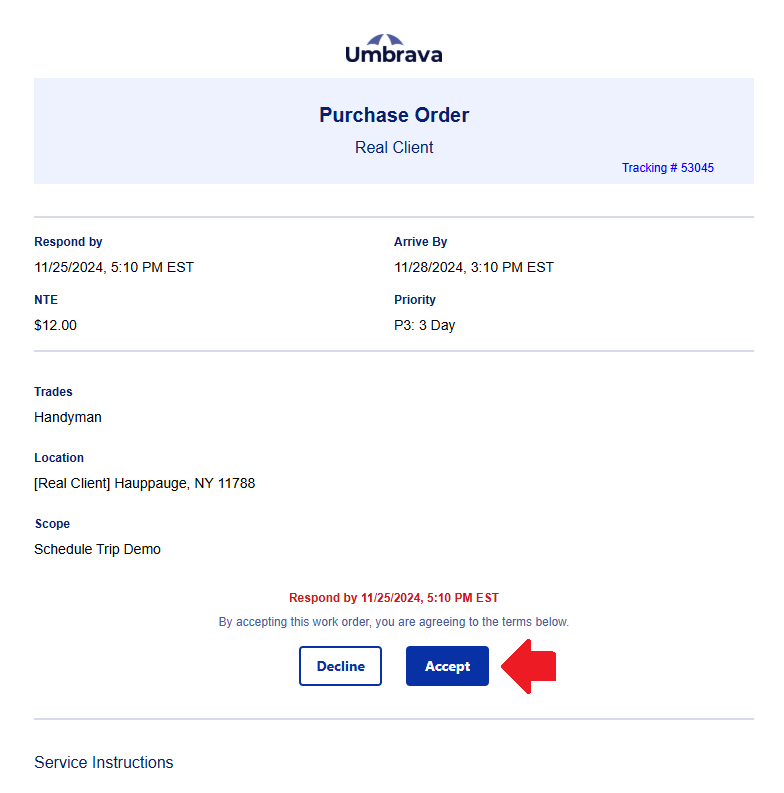If you don't have Auto-Accept turned on for your client, you will be able to enter a schedule date when accepting a Work Order. The schedule date here must be before the First Trip By date on your new Work Order. This will notify your Client for when you can be onsite.