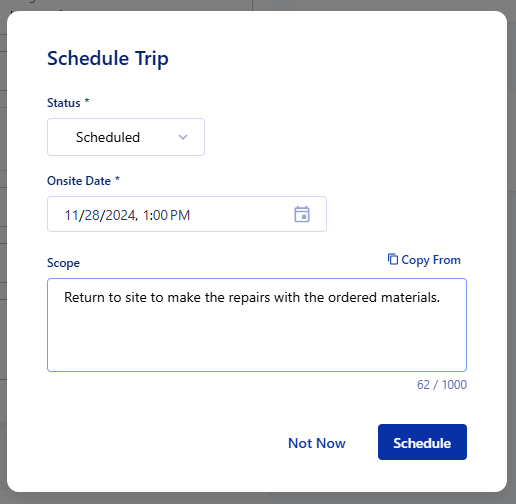 Step 2: Fill in the required Trip information, Onsite Date must be before Complete By date. |