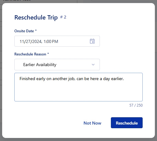 Step 2: Enter your new Onsite Date and Reschedule Reason. |