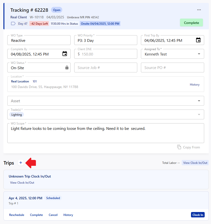 Step 1: Click the '+' button in the Trips section of the Work Order details. |
