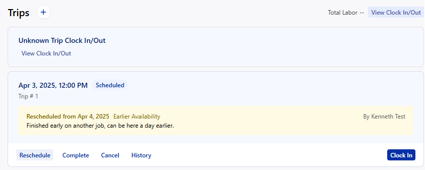 Sometimes your schedule doesn't go as planned. Reschedule your trips with your clients and let them know why a change was made. You an only reschedule a trip that has not yet been clocked in yet, and is still in the 'Scheduled' status.