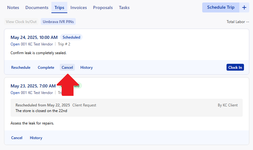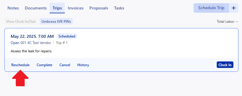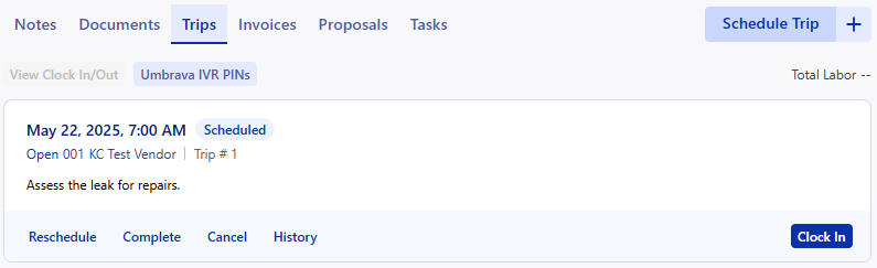 Your vendors can schedule a trip when accepting a Work Order to let you know when they will be onsite, and what they expect to accomplish. The vendors will clock in/out of the trips to record labor and tell you that they are onsite. You can manage these trips with your vendors to keep your Work Order information up to date.