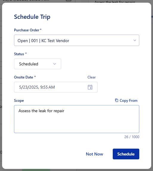 You can create a new trip for your Purchase Orders to keep track of when your vendors will be onsite and keep your communication and expectations open.