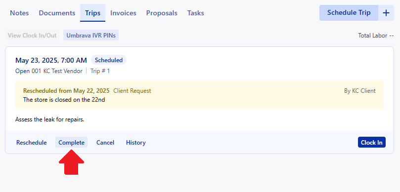 Completed trips will track how long your techs have been onsite and how much of the job has been completed. If you complete a purchase order, any scheduled trip will automatically be completed.