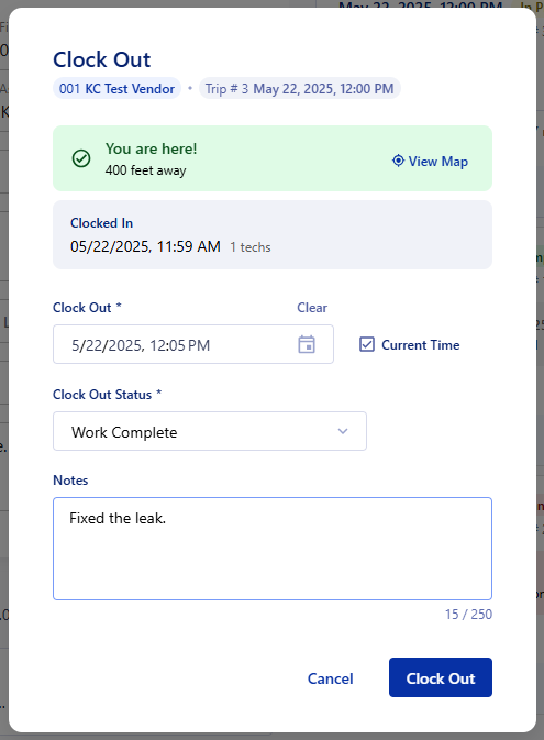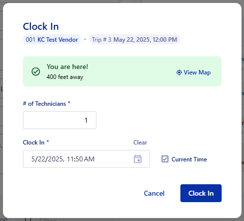 In the case that your vendor can't sign in, you can clock in and out for them to keep your work orders moving accurately. Clocking in and out of a trip will move the vendors Purchase Order along automatically and update the statuses of the Work Order and Purchase Order.