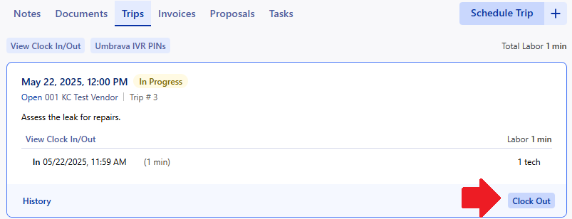 Step 3: When the trip is done, click the 'Clock Out' button on the In Progress Trip. |
