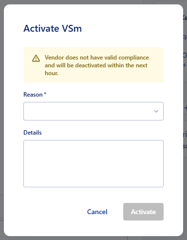 If you are reactivating a vendor, and that vendor has a compliance item that is due to expire, the warning will also be available on the Activate vendor screen.