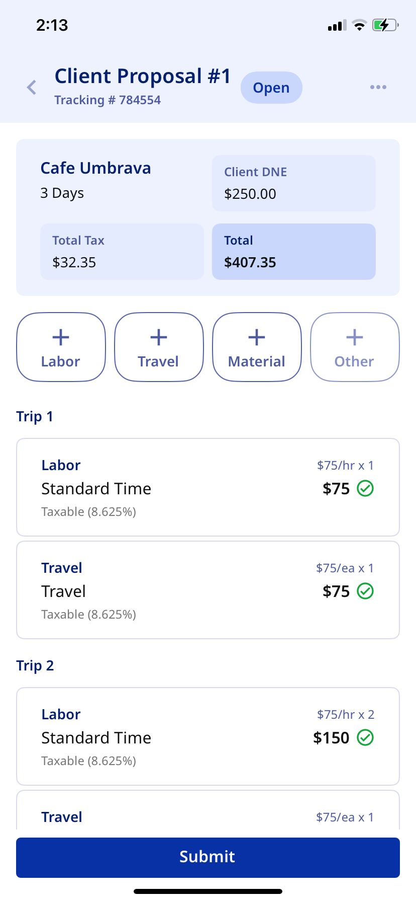 Your line items will be sorted by trip to help keep everything organized. Once everything is ready for submittal, tap the Submit button at the bottom and the proposal will be shared with your client and no longer editable.