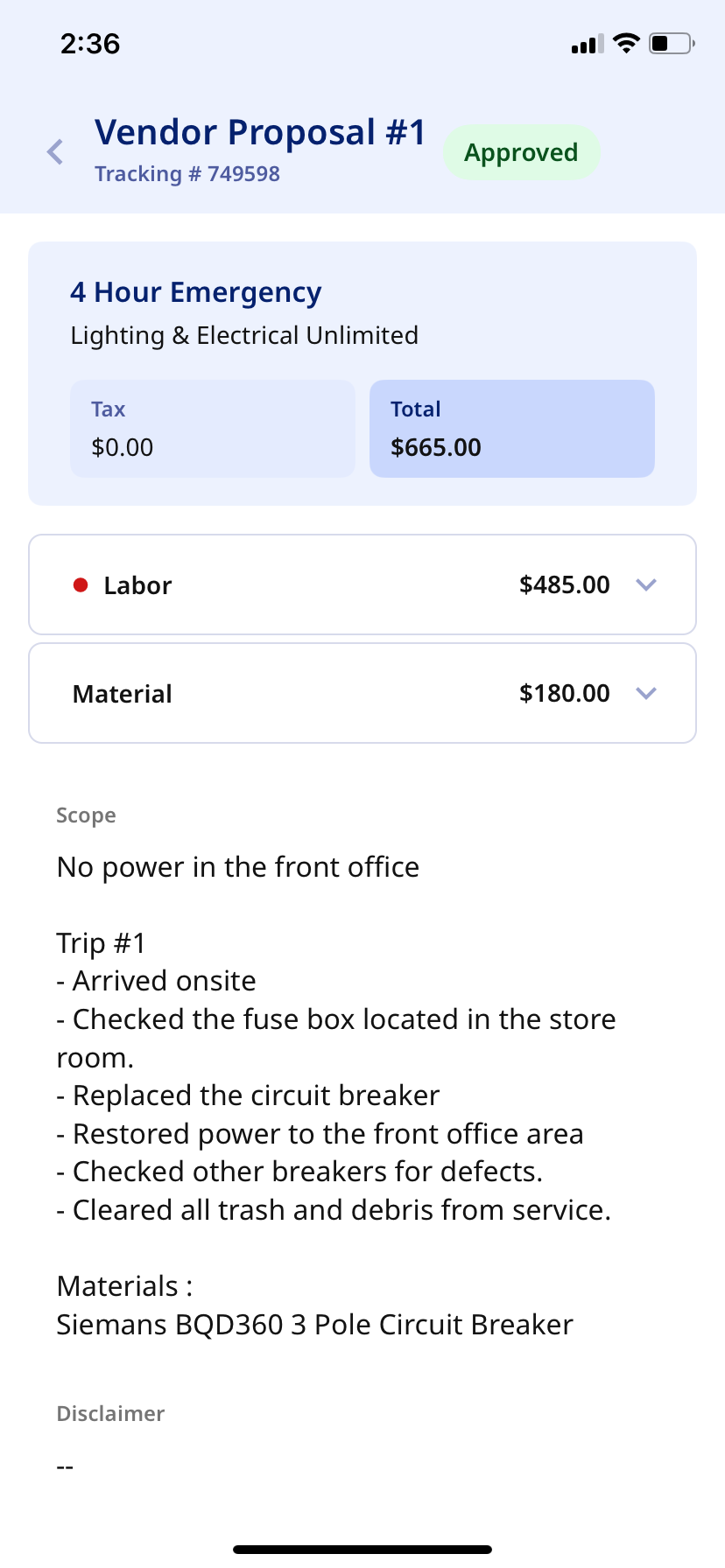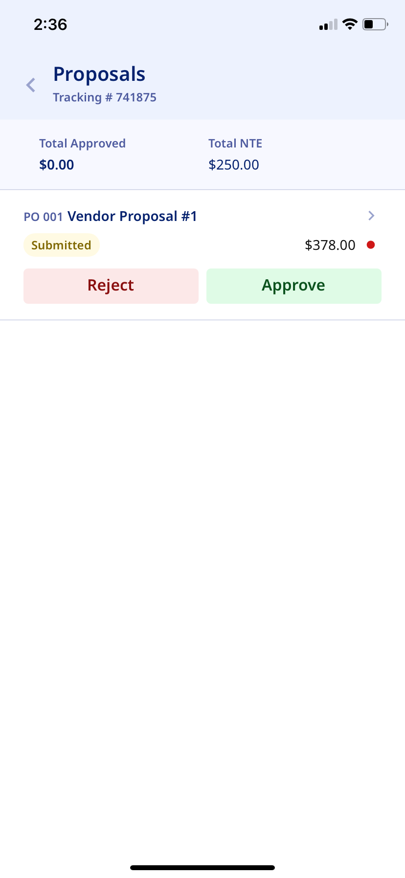 Clients will be able to view the proposals and approve or reject from the mobile app as well. Access the proposals for your work orders using the same process as above. Tap into the proposal to review the details. The example below is from 2 different Work Orders.