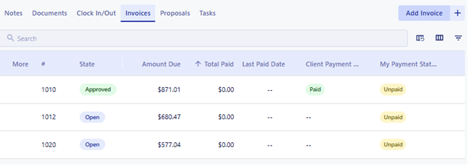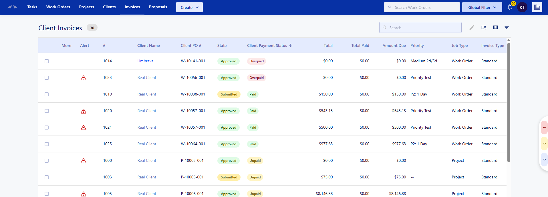 You can check your invoice payment status directly on the Work Order or Project that the invoice is created for. Click into the invoice tab of the job and the Client Payment Status column will show you the status for any and all invoices on that job.