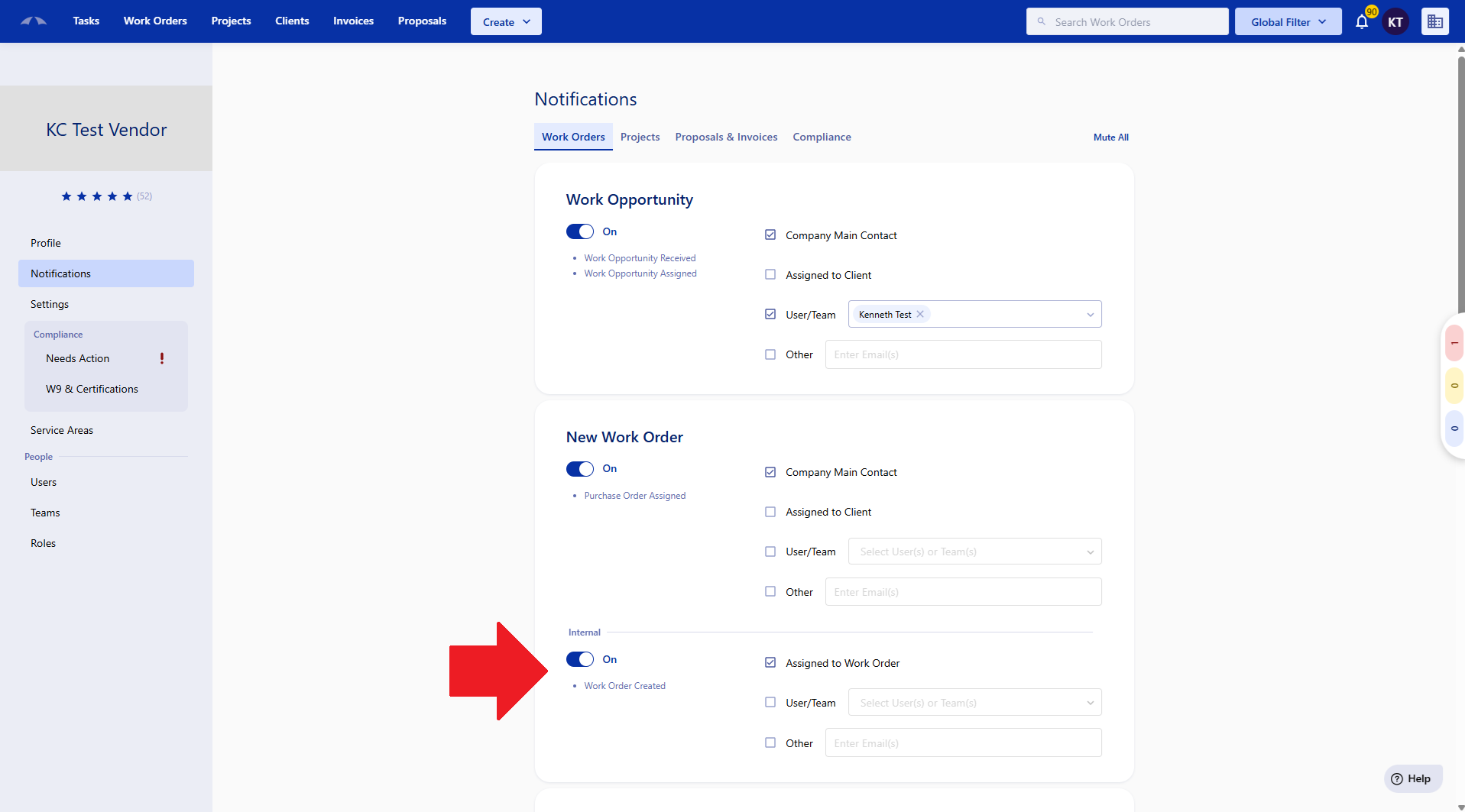 The New Work Order notification will send when a new work order is created for your company. If you set this notification on the client profile, then the notification will send when you create a work order for that client.
