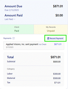 Clicking into an invoice will show your payment statuses in the Summary on the right side of the invoice. You can record your own payment information here as well to keep your own records.