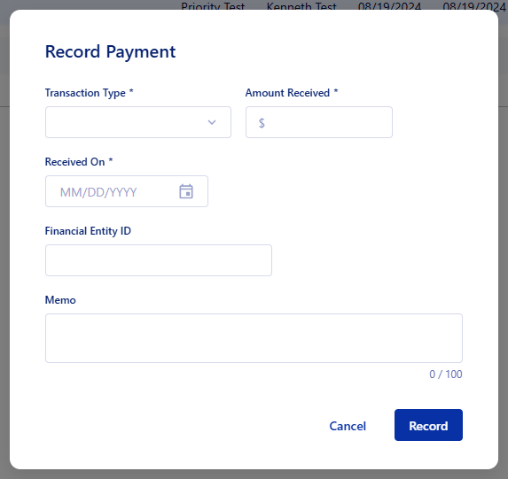 Clicking on 'Record Payment' will open our new screen to record your payments in the app. Fill in the information here to keep your records up to date within the app.