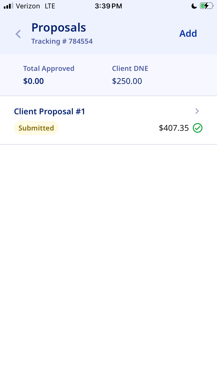 Your proposals can be created or viewed directly in the Work Order. Proposals flow seamlessly between the web and mobile app. To get started, tap the 'Add Proposal'. If a proposal already exists, tap the 'Proposals' button to add a new proposal or view and edit your existing proposals.