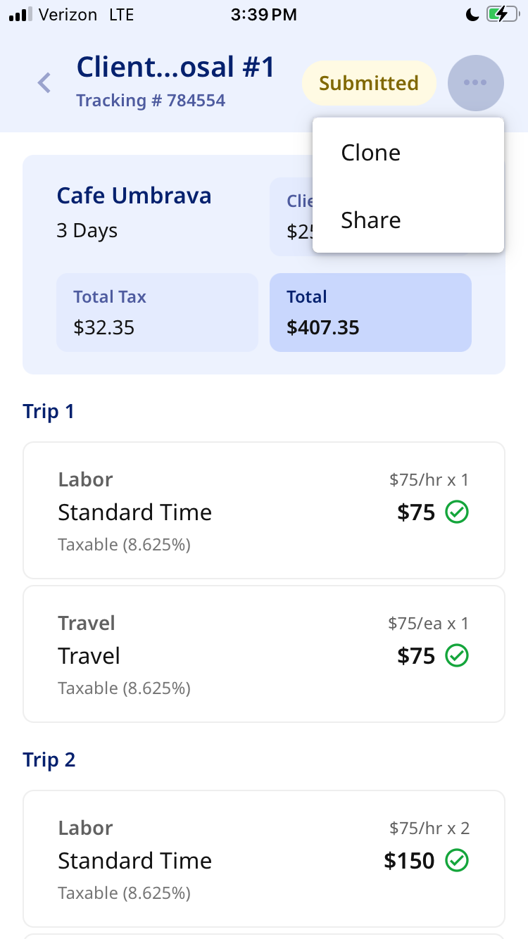 Once everything is ready for submittal, tap the Submit button at the bottom and the proposal will be shared with your client. A submitted proposal can no longer be edited.
