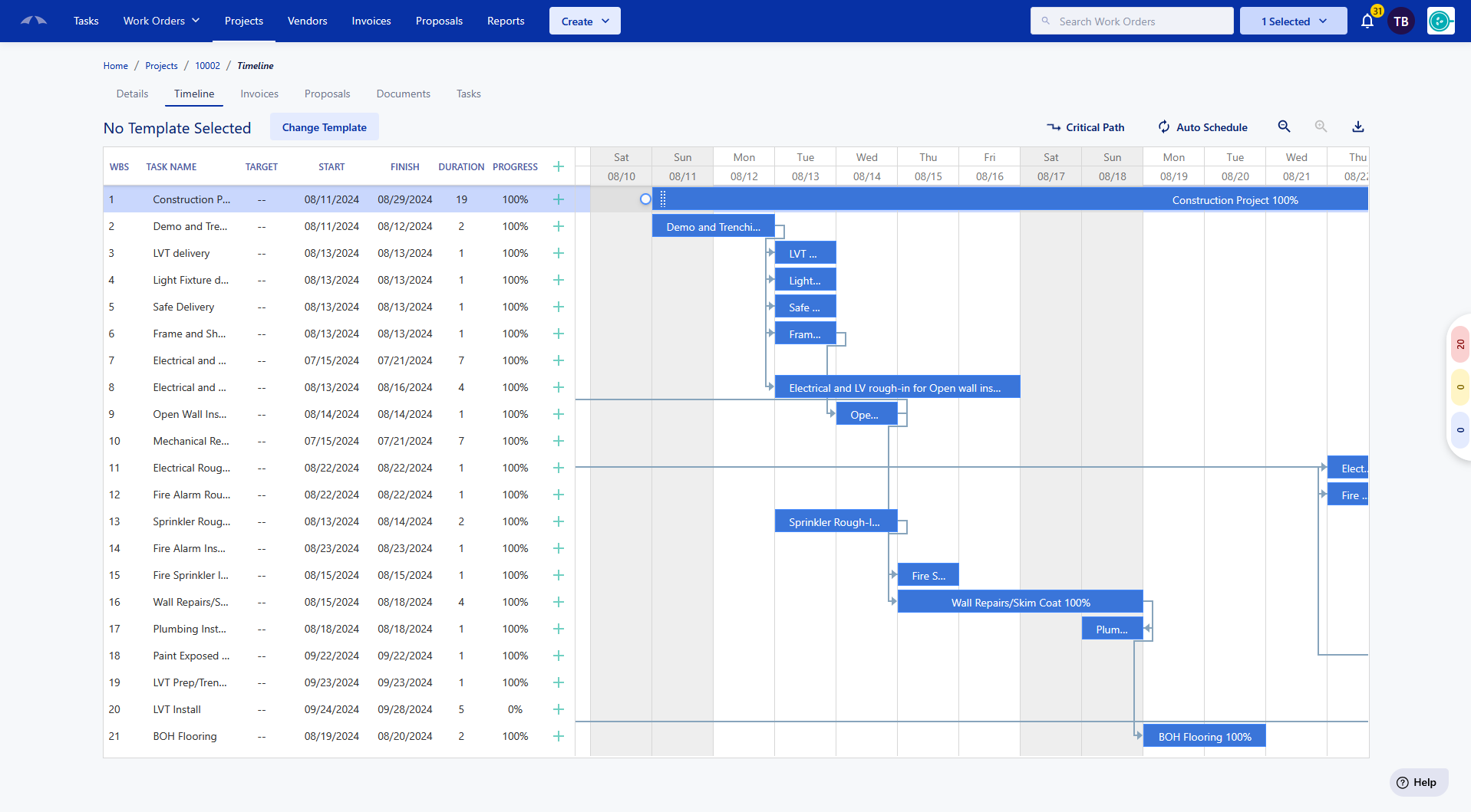 Keep track of the progress of your tasks. You can set the Progress percentage on the tasks by dragging the white arrow at the bottom of the task, manually typing it in on the progress column, or inputting the percentage in the edit screen. Once a task is above 0%, the task on the chart will update to visually represent that it has been started up until completion.