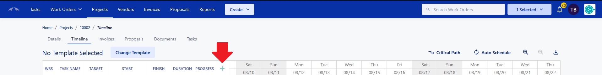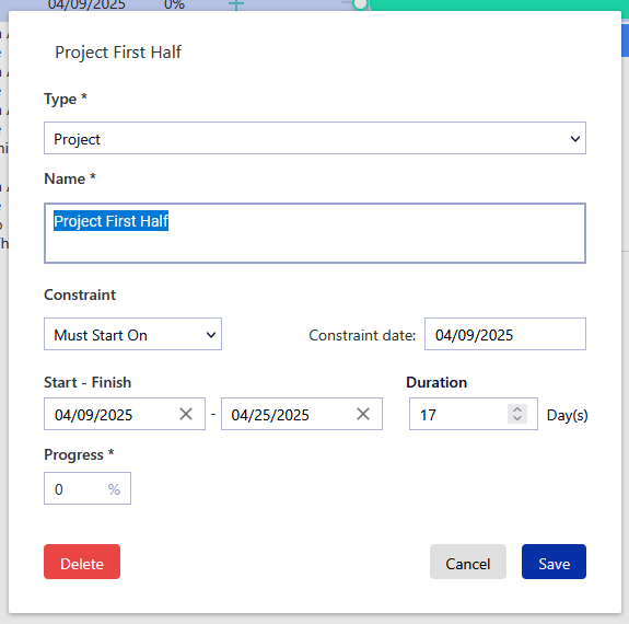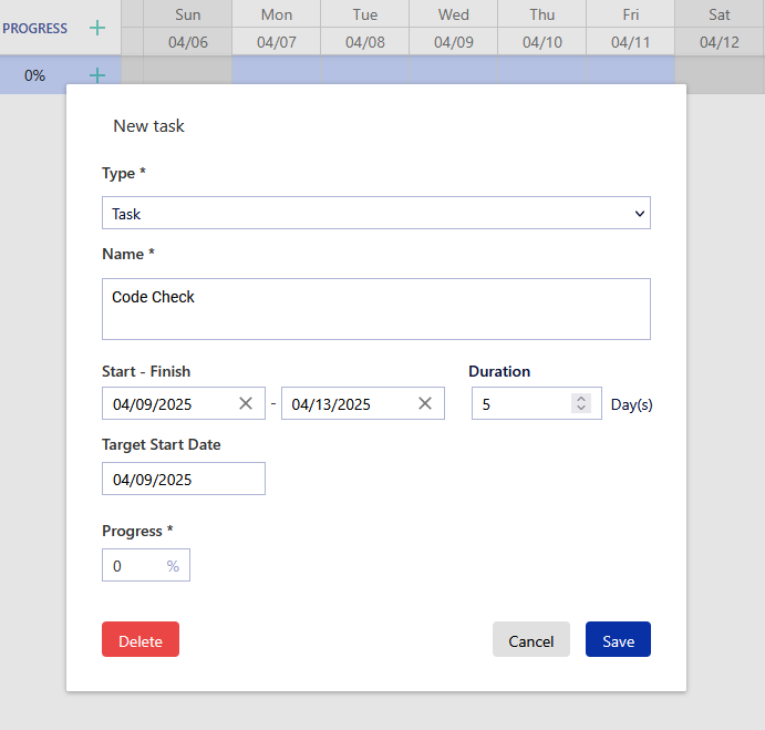 There are multiple types of tasks to guide your timeline to fit your needs and each Task Type functions differently. To create a task in the timeline, click the + button at the top of the Gantt chart. Fill in the required information for your tasks and click 'Save' to create your tasks.