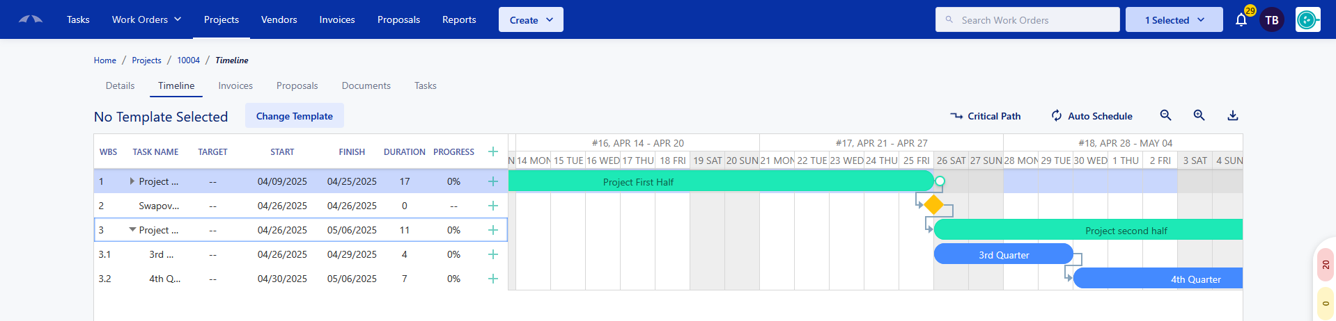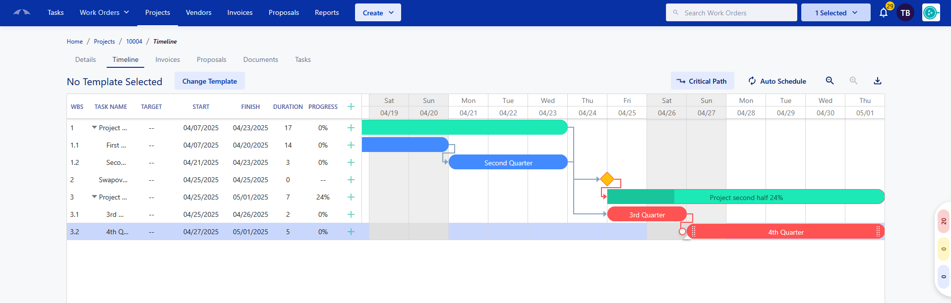 Milestones are a task that can be set for a singular date to signify an important moment/date in the project. Milestones are represented on the timeline with a diamond. Connect your tasks to a Milestone to keep the date updated with our Auto-Scheduler.