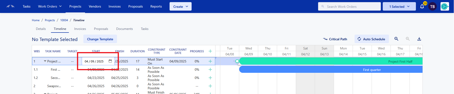 The constraints can be set via inline editing on the task line, or by opening up the edit screen for the individual task.