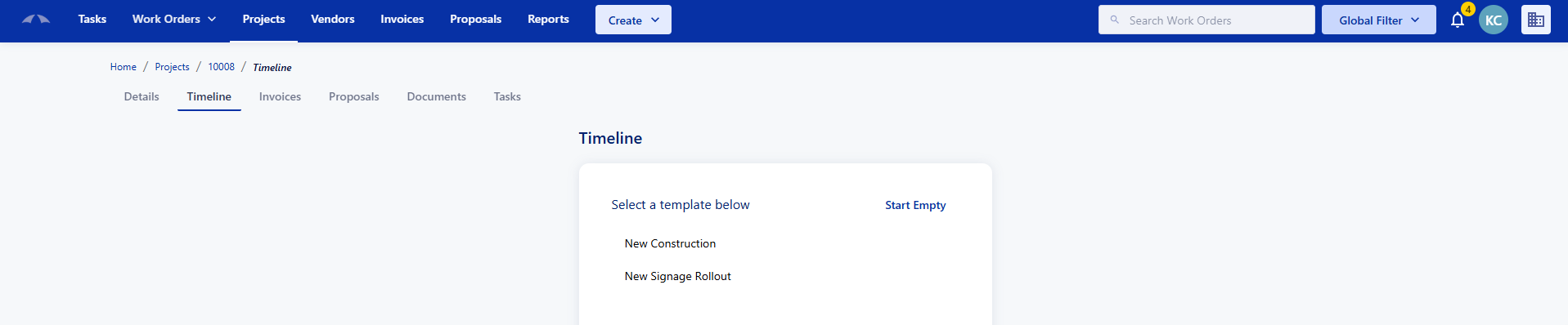 When accessing a Project Timeline for the first time, you will have the option to 'Start Empty' or to select a template that has already been created in your Project settings.