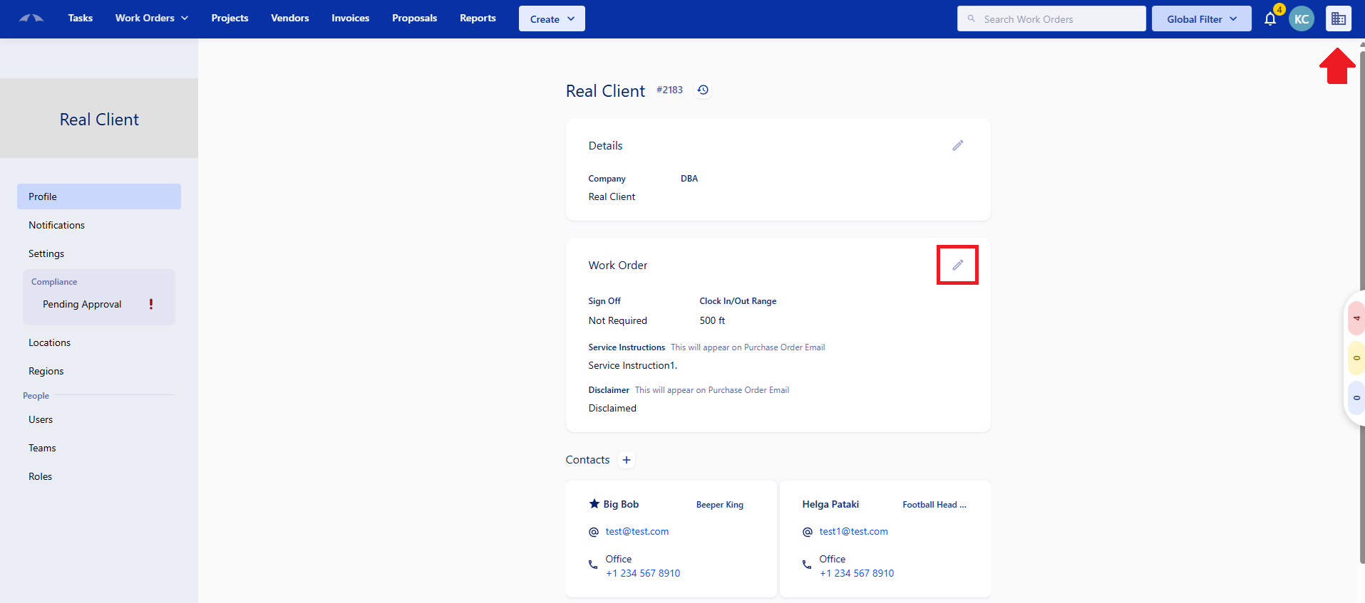 On the Company Profile, the Clock In/Out Range can be set for all of your locations in the Work Order settings. Click on the edit icon in the Work Order section to set the range.