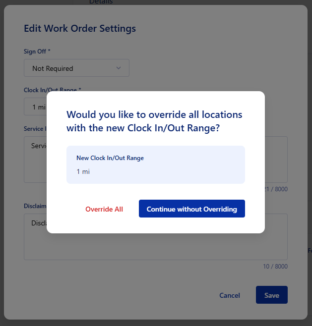 The range can be set individually for each location. The Work Orders for the location will use the setting within the location over the general setting in the company profile. When changing the setting on the company profile, and a location has its own range set, you will get the option to override all locations with the new range.